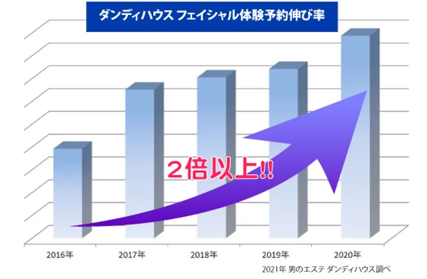 全国に45店舗を構える男のエステ ダンディハウスのフェイシャルコースをご利用されるお客様は年々増加しています。新規の方のフェイシャルコースのご予約数は5年前に比べると2.26倍になります。