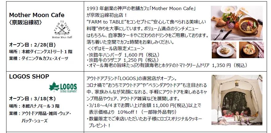 KUZUHA MALL(くずはモール) 春のNEW OPEN店舗詳細&イベント情報