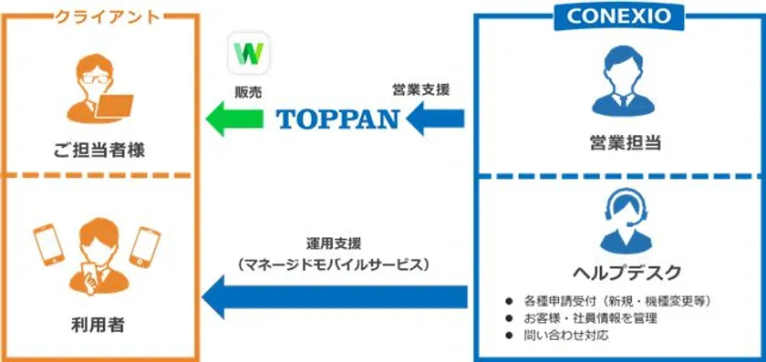 コネクシオは、これまで中小~大企業まで多数のクライアントに対して、モバイル端末や「LINE WORKS」を通じたコミュニケーションにおける課題解決、運用管理における支援を行ってきました。この度の凸版印刷との協業により、コネクシオは凸版印刷に対して「LINE WORKS」のライセンス販売営業活動と共に導入から活用(※2)、運用管理までをワンストップでサポートする「マネージドモバイルサービス」を提供することで、凸版印刷とクライアントのビジネスの拡大を支援いたします。