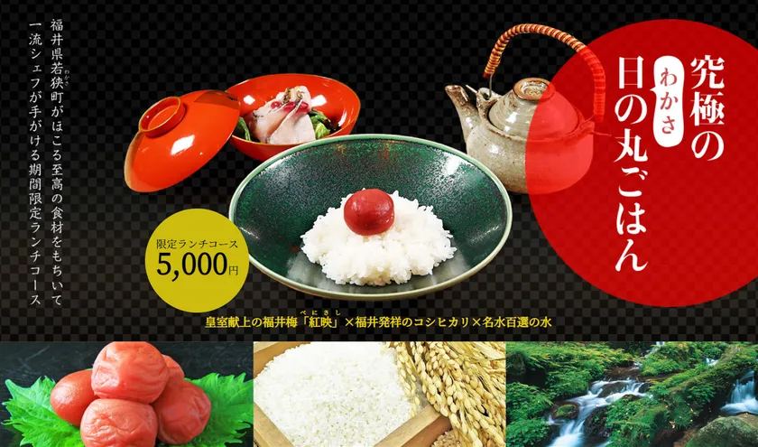 今回ご提供させていただくのは、若狭町で生産された皇室献上の福井梅「紅映(べにさし)」を、若狭町で収穫した福井発祥のコシヒカリを名水百選「わかさ瓜割の水」で釜炊きしたごはんに乗せた「日の丸ごはん」を主役とした、創作料理の限定ランチコースです。コース料理には、若狭町および若狭地方がほこる贅沢な食材をふんだんに用いて、主役に劣らない絶品をそろえます。