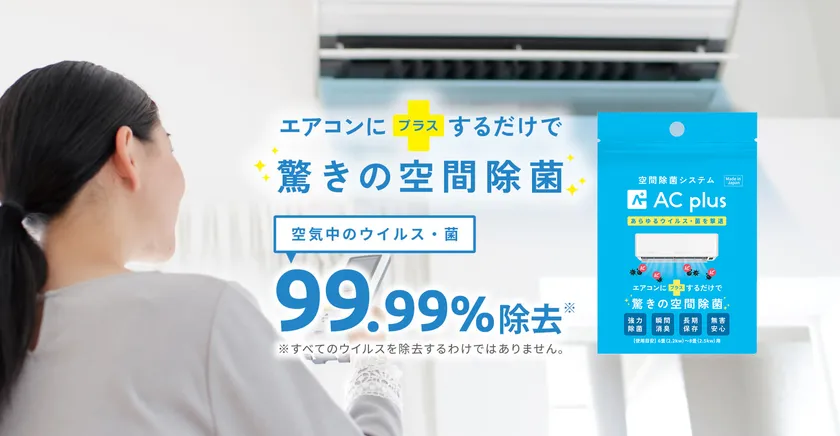 AC plusは、エアコンに安定化二酸化塩素を有効成分とする酸化分解型タブレットを設置するだけで、空間や物に付着するウイルスを除去、除菌、消臭できる環境浄化剤です。