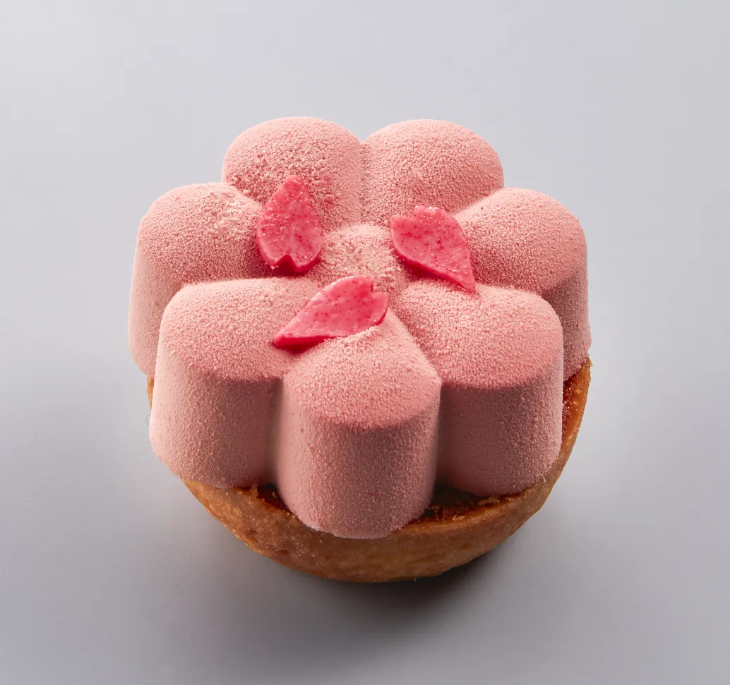 桜のジュレを紅茶のムースで包み、チョコレートタルトにのせたスイーツ。