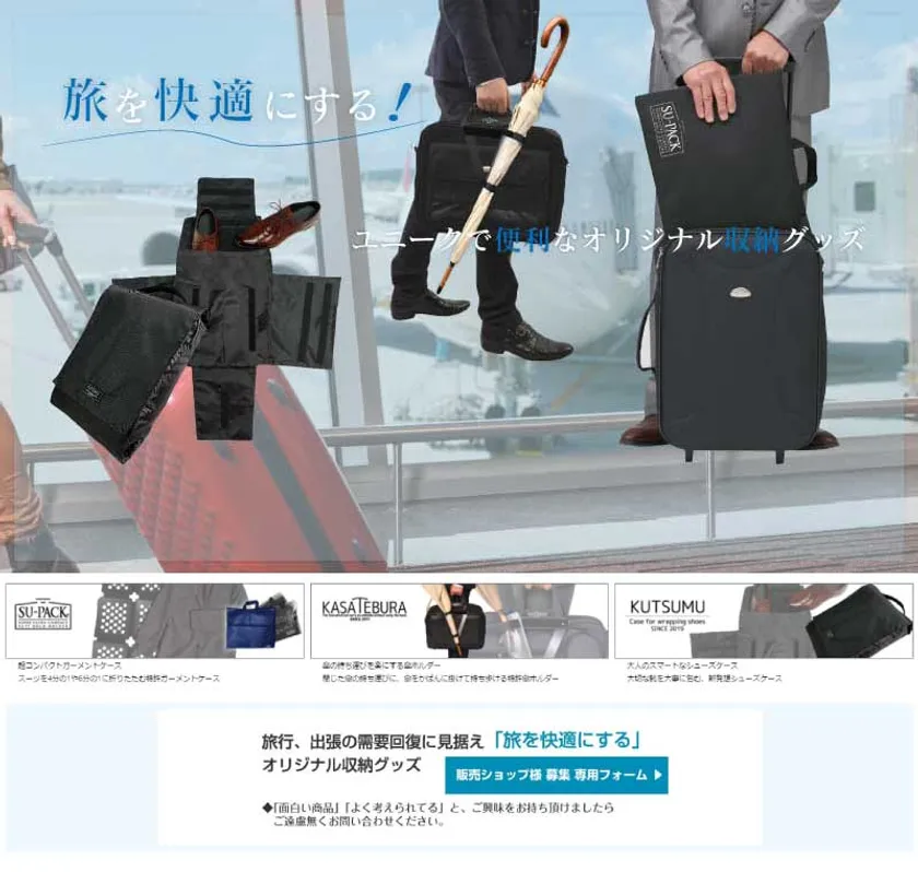 当社は、数々のメディアや雑誌に取り上げられ、東急ハンズ、ヨドバシカメラ、Amazon、楽天やネットショップでも大人気の累計37,000個以上の販売実績があるスーツを4分の1や6分の1に折り畳むコンパクトガーメントケース「SU-PACK」シリーズをはじめ、傘をカバンに掛けて持ち歩けるホルダー「KASATEBURA」シリーズ、靴を大事に包む「KUTSUMU」、二重の感染対策マスクシールド「遮断くん」と多数のアイデア商品を開発展開しております。