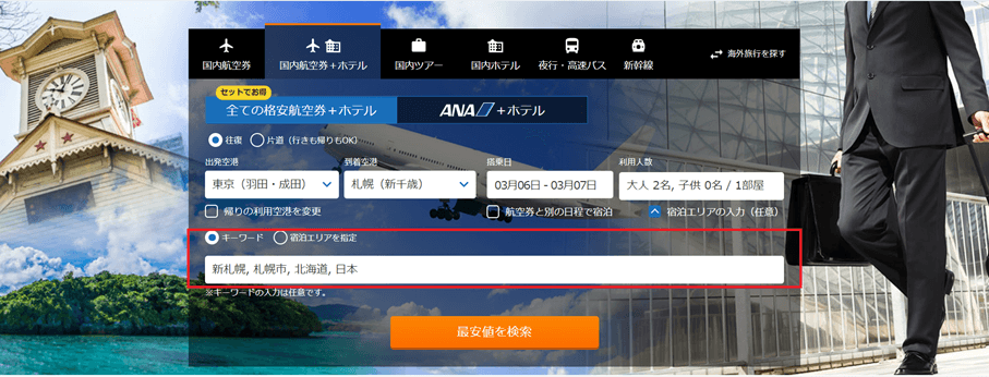 従来、国内航空券+ホテル(エアトリプラス)は、宿泊地のエリア絞り込みが可能でしたが、お客様の利便性向上のため、特定の観光地、ホテル名等のキーワードを入力頂くことにより、キーワードに合致する宿泊施設を検索できる機能を実装いたしました。