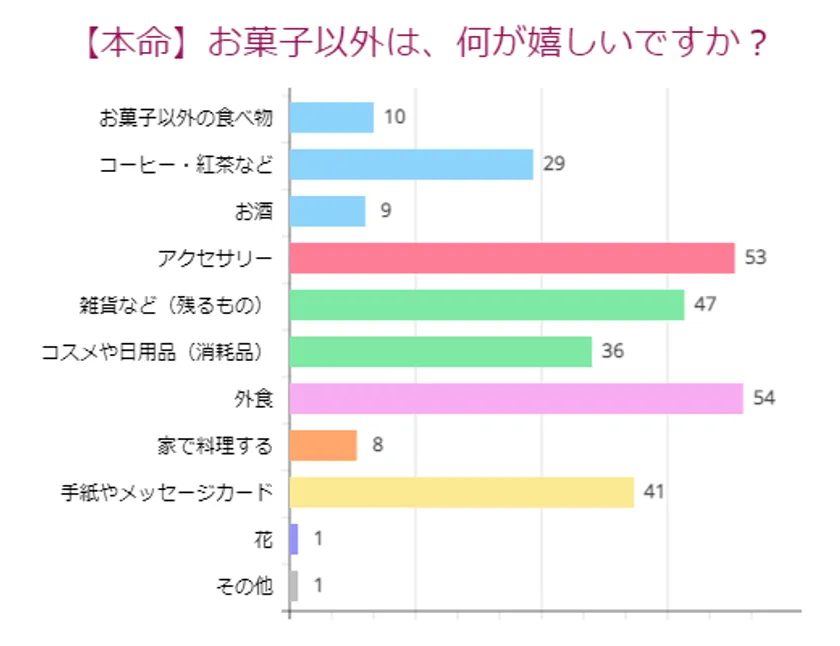 続いて、4位「お菓子以外の食べ物」2票、「お酒」「アクセサリー」「手紙やメッセージカード」1票、「外食」0票、その他2票。