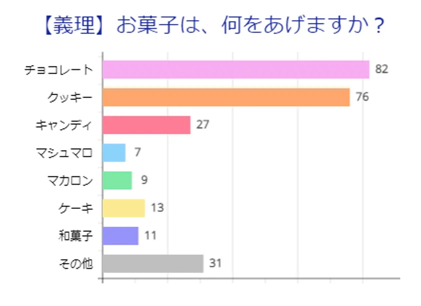 そのあとは、4位「キャンディ」12票、5位「和菓子」11票、6位「マカロン」10票、7位「マシュマロ」6票、その他は23票。