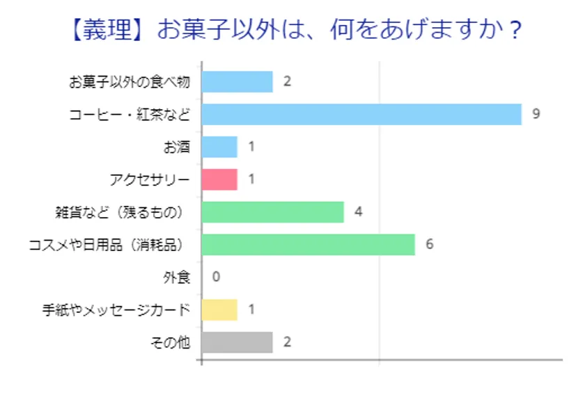 お菓子以外:1位が「コーヒー・紅茶などの飲み物」9票、2位が「コスメや日用品(消耗品)」6票、3位が「雑貨など(残るもの)」4票。