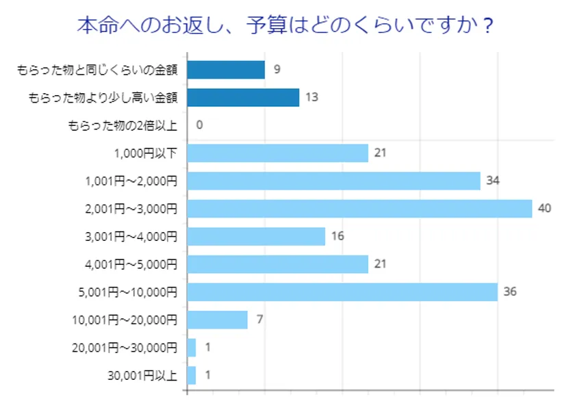 「1,000円以下」「4,001円~5,000円」ともに21名、「3,001円~4,000円」が16名、「もらった物より少し高い金額」13名、「もらった物と同じくらいの金額」9名、「10,001円~20,000円」が7名、「20,001円~30,000円」「30,001円以上」ともに1名、「もらった物の2倍以上」0名という結果でした。