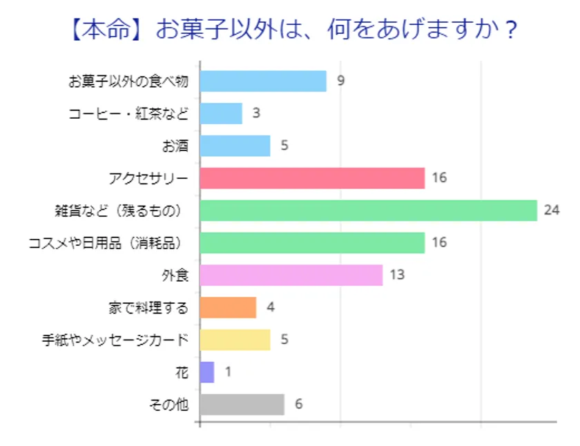 お菓子以外:1位が「雑貨など(残るもの)」24票、2位が「アクセサリー」「コスメや日用品(消耗品)」で同じ16票でした。