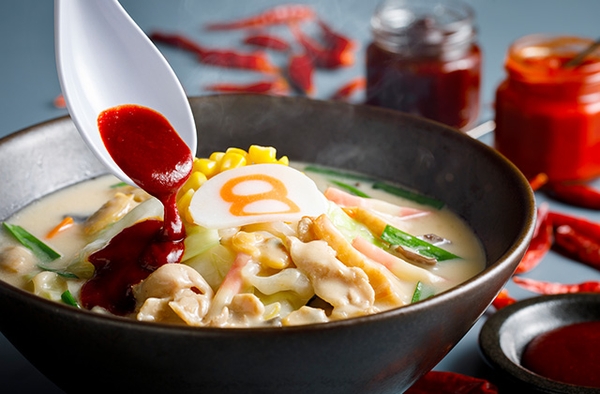 8番流「ちゃんぽんらーめん」は、生姜の香りとあさりの旨み、11種類の具材を使用した具だくさんのらーめんです。今年は辛みそで味変ができる「辛旨ちゃんぽんらーめん」も新登場です。