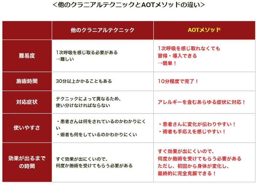 このように他のクラニアルテクニックと比較して、AOTメソッドは優れているポイントがたくさん存在するのです。