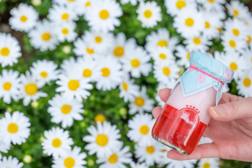 アカオハーブ&ローズガーデンをイメージし、鮮やかなバラの花びらを使用したソースと2層仕立てにしたプリンです。下の層は、ドライローズとバラのソースに、上のプリンの層は、バラと相性が良い杏仁と白桃で味付けした、香り高い上品なプリンに仕上げています。