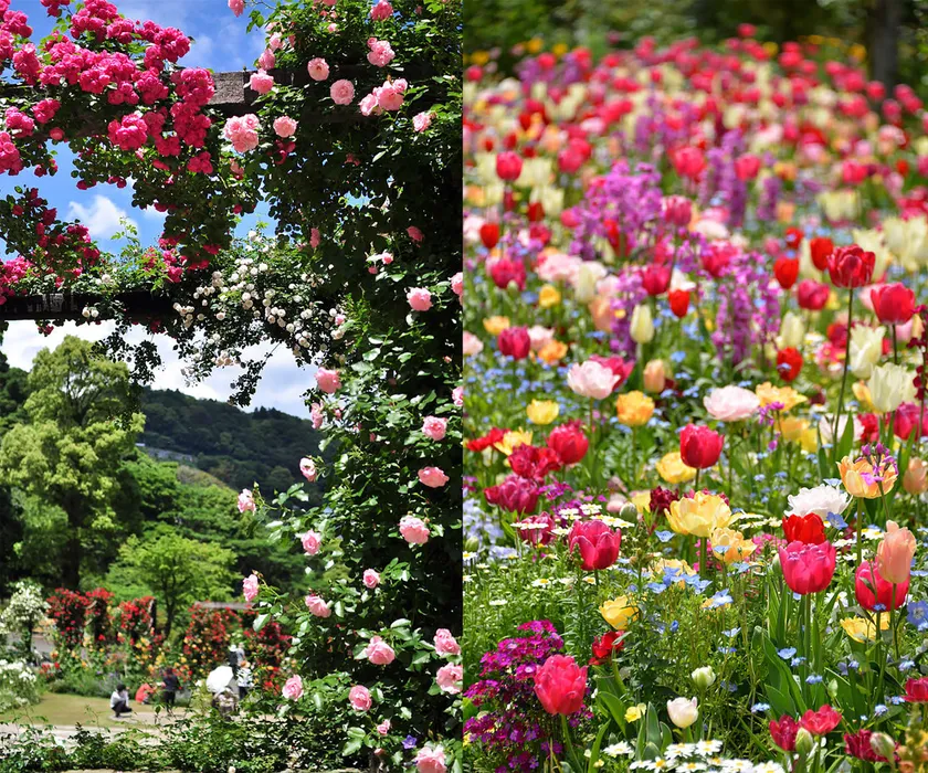 「アカオハーブ&ローズガーデン」は、海と山に囲まれた20万坪の敷地にイングリッシュローズガーデン、ハーブガーデンなど個性溢れる12のガーデンが点在し、移り行く季節とともに四季折々の花々をお楽しみいただける、熱海の観光名所の一つです。春は菜の花、4月中旬に咲く10万球のチューリップも見どころです。