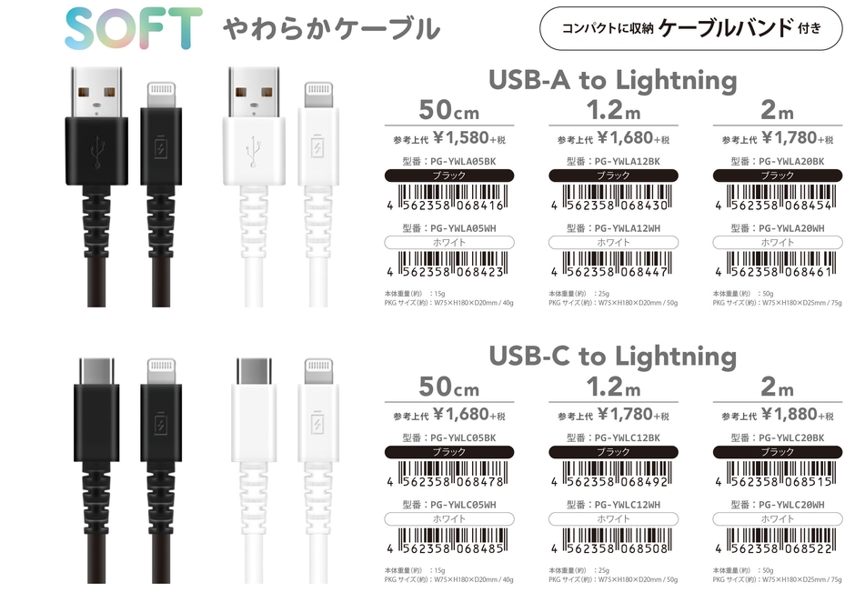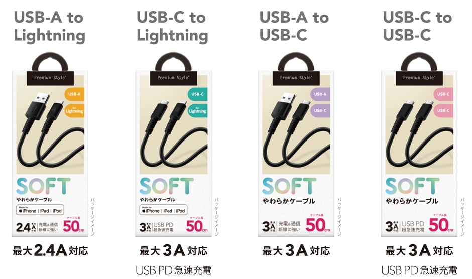 やわらかいのに強い Premium StyleのSOFTやわらかケーブル12種 絶賛発売中