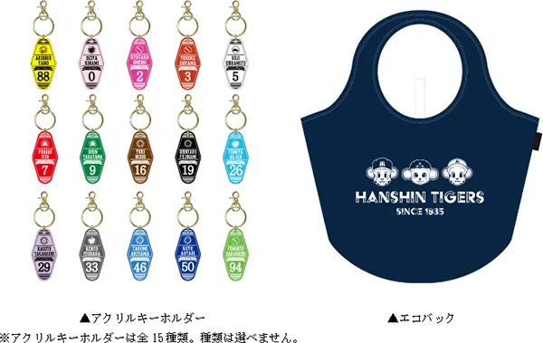 監督・選手コラボ弁当(前述の各コラボメニューのうち、☆の記載があるメニュー)を1個ご購入ごとに、「監督・選手オリジナルアクリルキーホルダー」を1つプレゼントします。また全ての弁当をご購入されたお客様には「タイガースオリジナルエコバック」をプレゼントいたします。