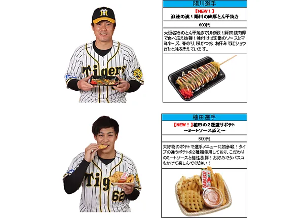 また甲子園球場名物の監督・選手グルメをより多くのお客様に楽しんでいただくため、内野2階中央エリアに監督・選手コラボグルメの専門店「タイガースフードコート ミニ」を3月9日(火)のオープン戦開催日から新規オープンします。オープン戦期間中は、新メニューの一部を先行販売しますので、是非ご来場ください。