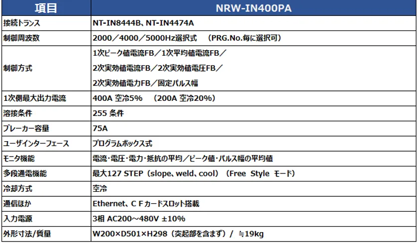 【高信頼性インバータ式抵抗溶接機【NRW-IN400PA】の特長】