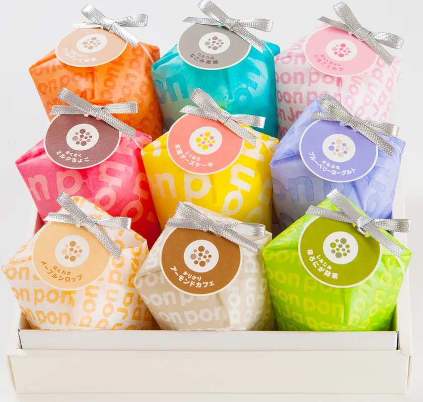 「pon pon Ja pon(ポンポンジャポン)」は、四角くて堅い「おこし」のイメージを覆した、丸いひと口サイズの新感覚おこしで、2011年に登場して以来、ロングセラーのブランドです。お米のパフと和洋様々なフレーバーを組み合わせました。カラフルでかわいらしい、紙風船のようなパッケージも人気の秘訣で、女性のお客様にも気軽に手に取ってもらいやすいよう工夫しています。フレーバーは全部で12種あり、プレゼントする方の事を考えながら選ぶ時間もお楽しみ頂けます。