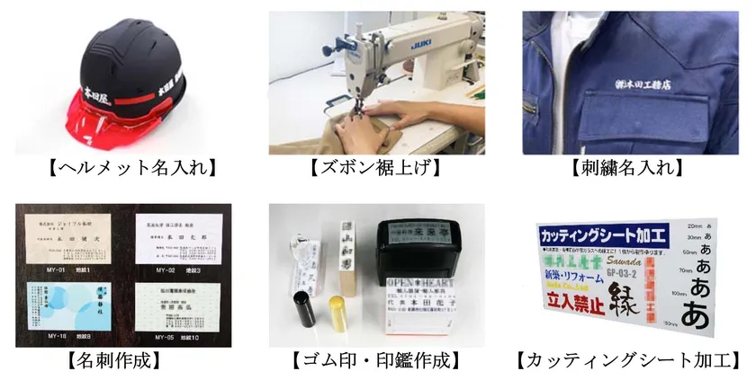 名入れ、裾上げ、刺繍、名刺作成、印鑑・ゴム印作成のサービスに加え、カッティングシート加工サービスも開始。カラーコーンの文字入れ等にも対応。