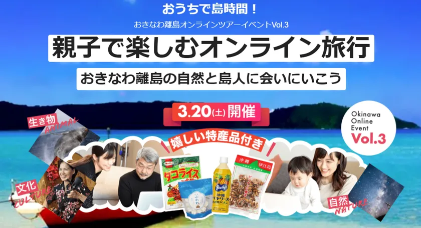 第3弾は“親子で楽しむ”をテーマに、子どもから大人まで自宅で楽しめる3つの体験がセットになった「親子で楽しむオンライン旅行~おきなわ離島の自然と島人に会いにいこう~」を3月20日(土)に開催いたします。