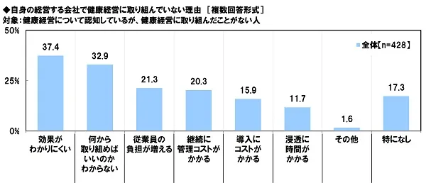 健康経営について認知しているが、健康経営に取り組んだことがない人(428名)に、自身の経営する会社で健康経営に取り組んでいない理由を聞いたところ、「効果がわかりにくい」(37.4%)が最も高くなりました。健康経営に取り組むことで実際にどのような効果が得られるのかがわからないと、実践段階に進めないと考えている人が多いようです。以降、「何から取り組めばいいのかわからない」(32.9%)、「従業員の負担が増える」(21.3%)が続きました。