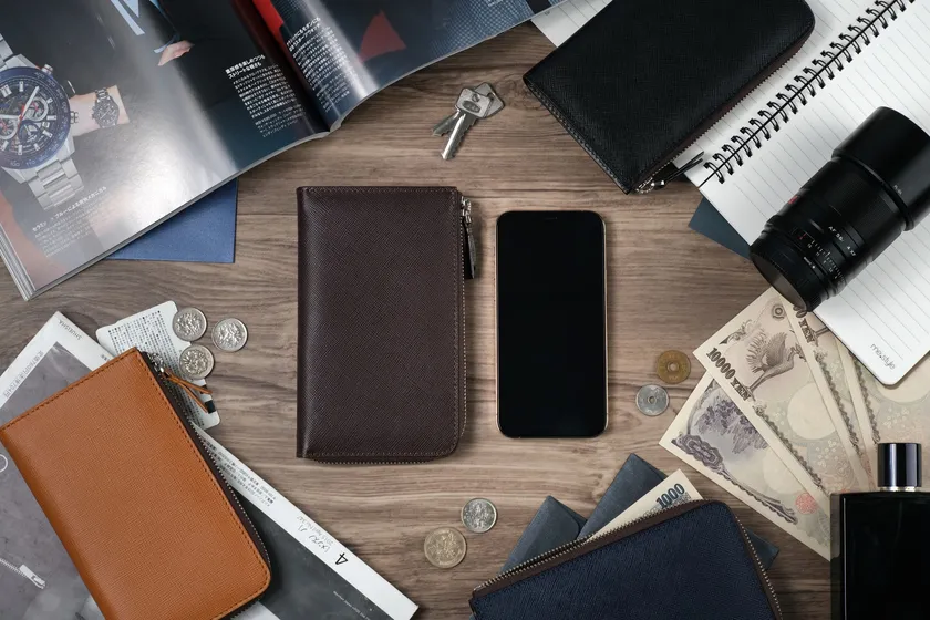 極薄で使いやすいLファスナー。サフィアーノレザー仕様