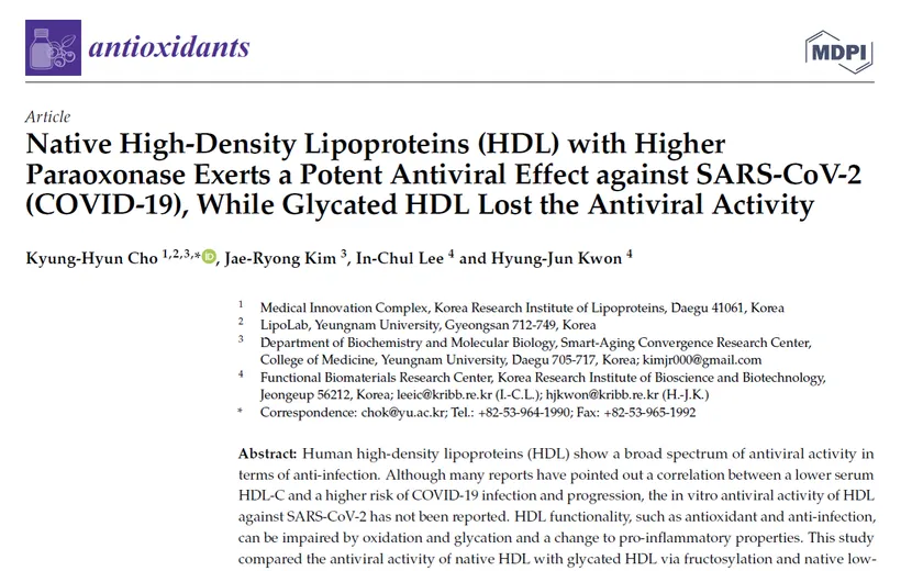 株式会社レインボーアンドネイチャージャパン(本社:東京都港区、代表取締役:リ・ビョング)は、関連研究機関の韓国リポタンパク質研究所が「健康で質が高いHDLは新型コロナウイルス(COVID-19)に対して非常に強力な抗ウイルス効果を持ち、逆に糖化プロセスにより損傷したHDLは抗ウイルス能力を失う」という事実を発見し、その研究論文がジャーナル「Antioxidantsオンライン版」に掲載されたことを報告します。