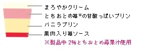 (2) 甘酸っぱいとちおとめ苺プリンとコクのあるバニラプリン、2種類のプリンに果肉入り苺ソースを組み合せ、まろやかクリームでまとめました。