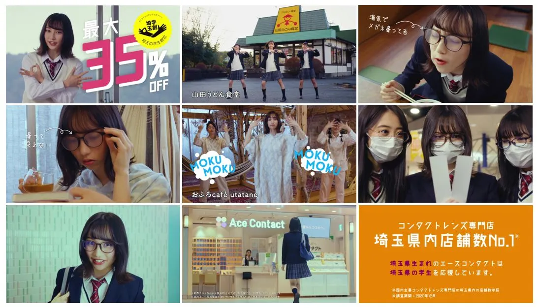 「恋はMOKUMOKU コンタクトレンズで楽しい学校生活を!」には、埼玉県育ちのモデル・神谷 侑理愛さんが出演。埼玉を舞台に、メガネをかけた女子高生の『恋のミッション』と銘打った恋模様を元気にコミカルに演じています。動画の最後にメガネを外し、男子高校生と見つめ合うシーンが印象的です。時折見せるコミカルなダンスやおちゃめな表情にもご注目ください。地元の学生を応援する企業である「山田うどん食堂」「おふろcafe utatane」「エブリデイとってき屋」にロケ地として協力いただきました。