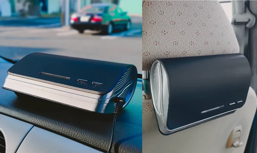車内の空気の流れに沿った場所に設置することができれば空気清浄機の能力を更に発揮できると考え、運転席はダッシュボード、後部座席はヘッドレストへ設置できる空気清浄機を開発しました。