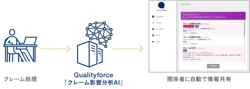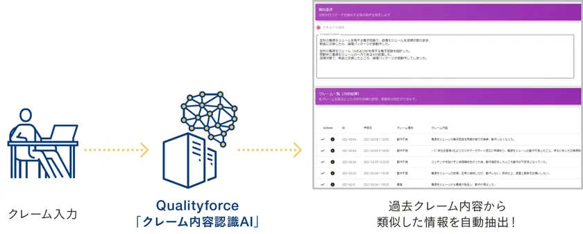 Qualityforceは、各メーカーがデータベースに蓄積している過去クレームの「症状・原因・対策」をAIが分析し、新たに寄せられたクレームに対する「責任の所在」、「原因の推定」、「取りうる対策とその根拠」を即座に提示することで、クレームへの初動対応を強力に支援するITシステムです。