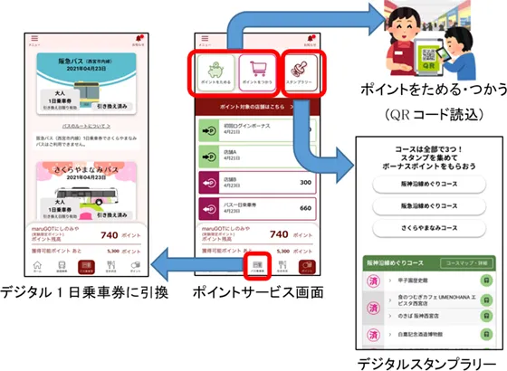 実験期間中、対象の施設・店舗でのご利用や様々なイベントを通じて、モニターの方にポイントを付与します。取得したポイントは西宮市域(一部市域外を含む)の実験協力店舗・施設等でご利用いただけます。また、本アプリ限定のデジタル1日乗車券(阪急バス(西宮市内線)1日乗車券・さくらやまなみバス1日乗車券)との引換も可能です。