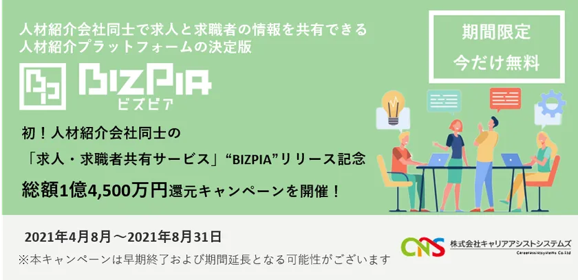 株式会社キャリアアシストシステムズ(本社:大阪市中央区、代表取締役:中庭 英雄、以下 当社)は、2021年4月8日から同8月31日までの約5ヶ月間、業界初の人材紹介会社同士の「求人・求職者共有サービス」“BIZPIA”のリリースを記念し、BIZPIAを無料で利用しつつ、利用に応じて現金還元を受けられる「リリース記念 1億4,500万円還元キャンペーン」を開催いたします!