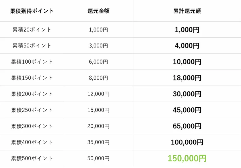 (2)「求人公開」・「公開した求人での選考」・「求職者推薦」をした場合にポイントを付与させていただき、期間内での累積ポイントに応じて現金還元させていただきます。詳細は下記表をご覧ください。