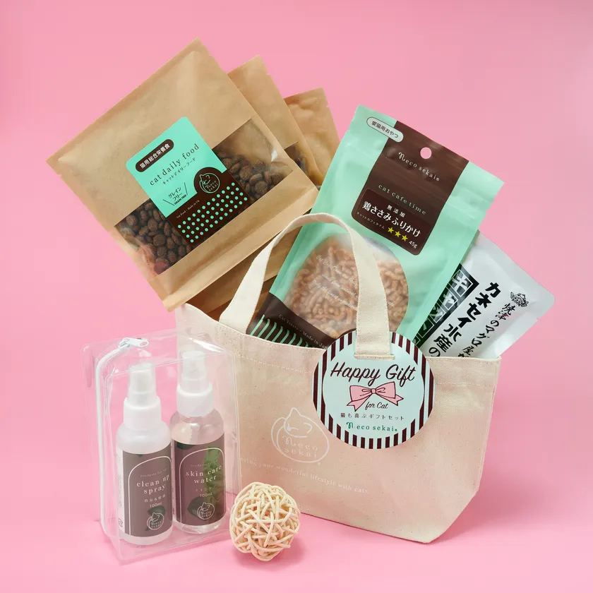 (フードやおやつ、消臭剤、おもちゃなどをオリジナルトートに入れた猫用品の詰め合わせ)