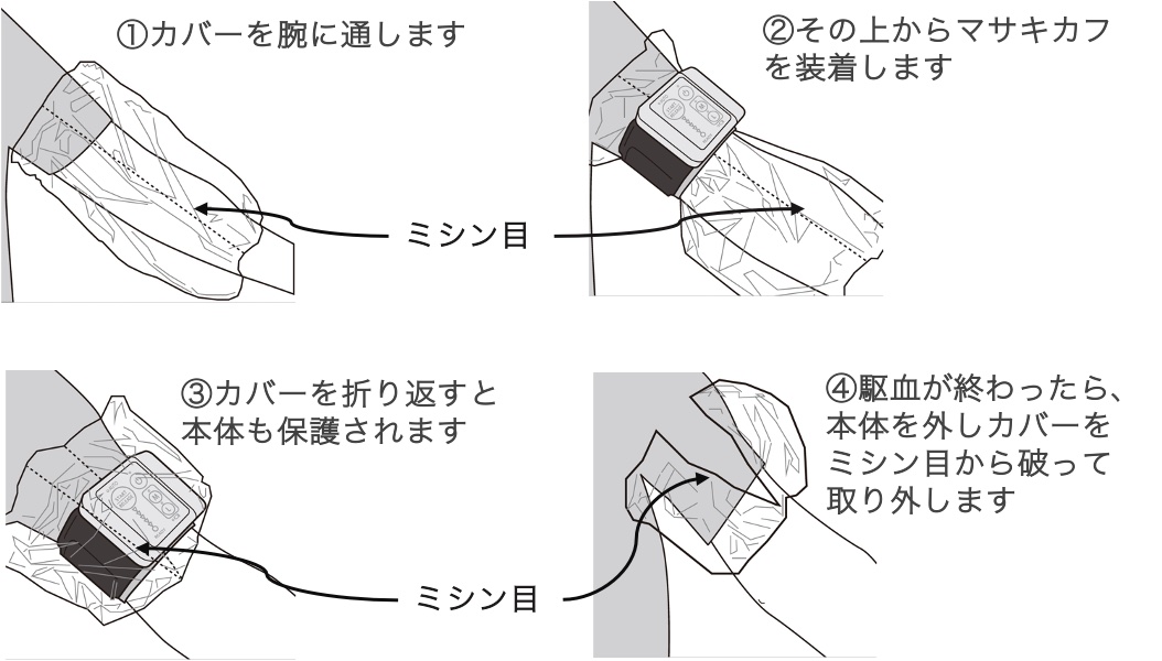 さらに患者間の感染防止対策品として、「マサキカフ専用ディスポーザブルカバー」が用意されています。本カバーは装着した腕だけでなく機器本体もカバーできますので血液などからの本体の飛沫保護にも役立ちます。
