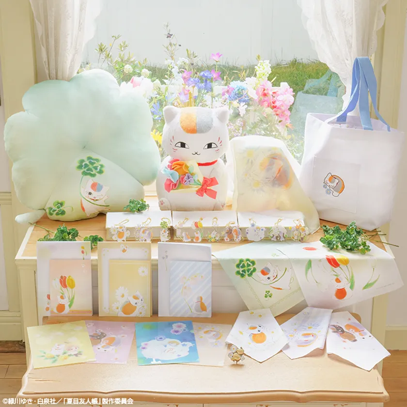 このほかにもクリアファイルセットやレターセットが選べるステーショナリーアソート、お花とニャンコ先生がプリントされたハンカチーフ、描きおろしイラストを使用したアクリルチャームと、花言葉をテーマにした春らしいデザインの実用雑貨を中心に多数取り揃えました。