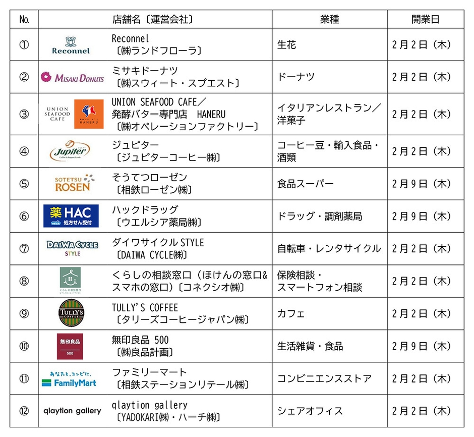 相鉄グループの㈱相鉄アーバンクリエイツ(本社・横浜市西区、社長・森村 幹夫)と㈱相鉄ビルマネジメント(同)では、2022年11月15日に発生した火災の影響で延期となっていた、相鉄本線 星川駅~天王町駅間高架下の新施設「星天qlay(ホシテンクレイ)」のBゾーン(星川駅部)を、2023年2月2日(木)と2月9日(木)に順次オープンします。