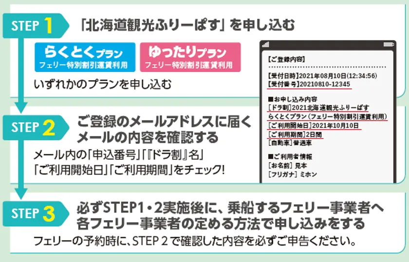 フェリーの運送約款、各フェリー事業者の「フェリー特別割引運賃」の実施期間、内容、空席情報などをご確認の上、下記の手順でお申し込みください。