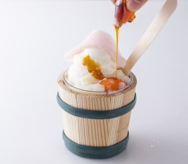 桶の中に入った固めのクラシックプリンの上に、たっぷりのチーズクリーム!さらに手ぬぐいに見立てた求肥をのせ、まるでお風呂に入っているかのようなスイーツに。