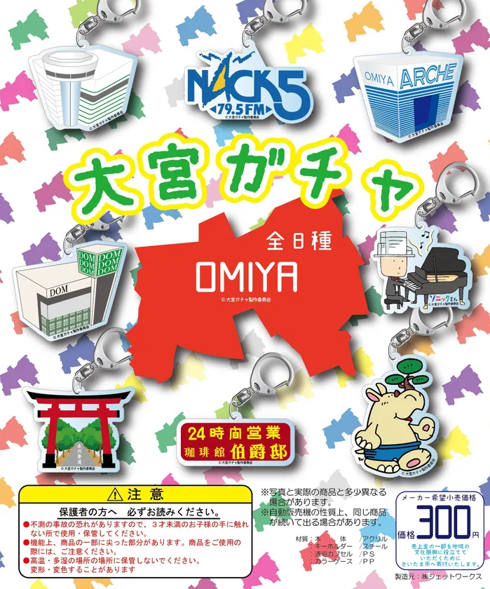 今回は、ご当地“大宮ガチャ”の第一弾とし、大宮のパワースポットを代表する日本一参道の長い氷川神社を始め、FMラジオでは関東圏で聴取率1、2位を争うFM NACK5、大宮のお買い物スポットの定番である、アルシェ大宮・そごう大宮店、大宮西口DOMショッピングセンターなど全8種類のラインナップ。