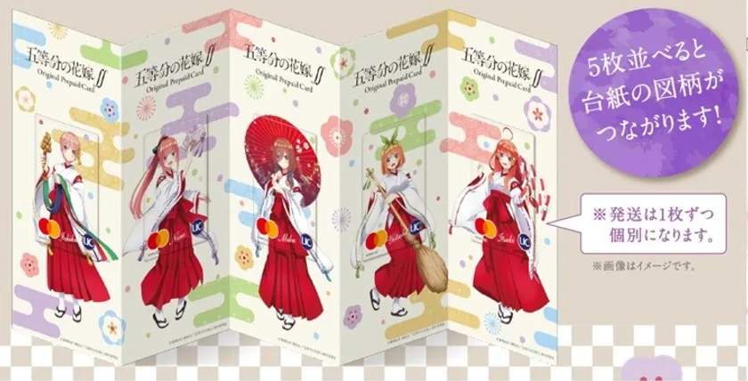ユーシーカード株式会社(代表取締役社長:中西 章裕、以下 ユーシーカード)は、TBSほかで絶賛放送中のTVアニメ「五等分の花嫁∬」とコラボレーションしたプリペイドカードの販売を2021年3月1日(月)より開始いたしました。
