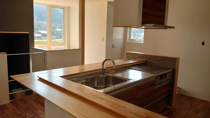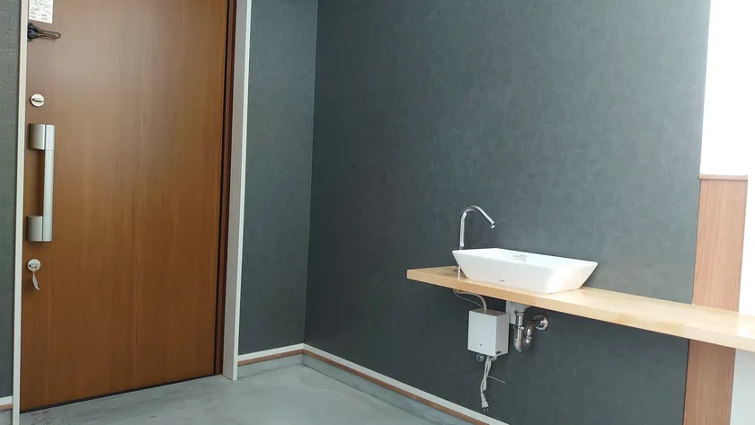 こちらの移住体験住宅は高速インターネット通信環境を整備済みで、背景を気にせずオンライン会議ができるようパーティションを設置したり、リビングでもテレワークが可能となるスペースを設けたりするなど、テレワークに対応しています。また、玄関に手洗い場を設けるなど、新型コロナウイルス感染症対策も行っています。