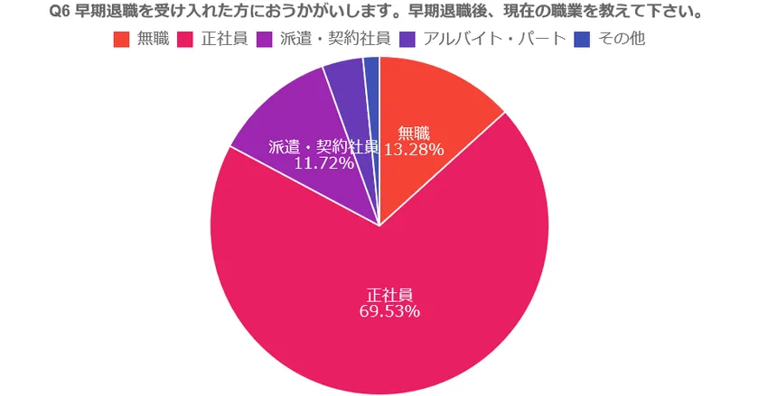 早期退職を受け入れたと回答した方に現在の職業を聞いたところ、69.53%の方は現在も正社員を続けていると回答しました。