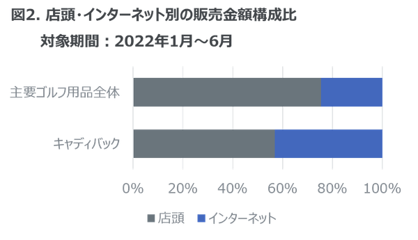 ・2022年1月~6月のキャディバックのインターネット販売比率は、同品目の販売金額全体の約40%となり、主要ゴルフ用品全体と比較して高い傾向が見られた。