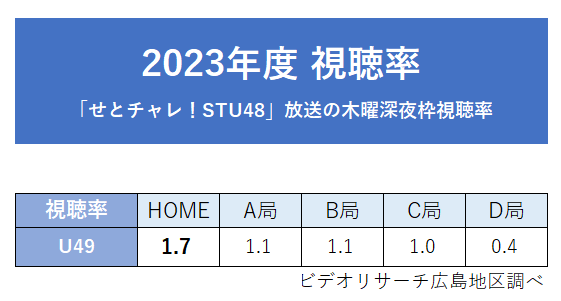 毎週木曜深夜0時15分から放送してきた「せとチャレ!STU48」が2023年度視聴率において<49歳以下視聴率1.7%>で同時間帯1位となりました。