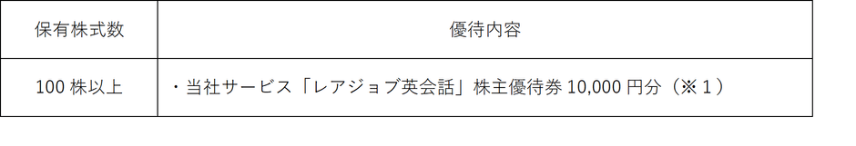 ※1.株主優待券のご利用上限金額は、利用者様がご契約いただいております当社サービス「レアジョブ英会話」の1か月分の料金となります。ご契約プランが月額10,000円を下回る場合において、差額分については返金いたしません。