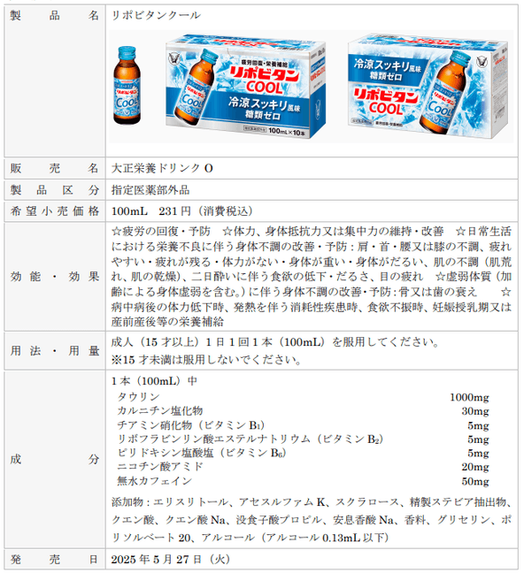 大正製薬株式会社[本社:東京都豊島区 社長:上原 茂](以下、当社)は、疲労の回復・予防効果に加え、リポビタンシリーズ初となる冷涼感のある風味のドリンク剤「リポビタンクール」(指定医薬部外品)を、2025年5月27日(火)より順次全国発売いたします。本製品は、セブン‐イレブン、ファミリーマート、ローソンにてお求めいただけます。