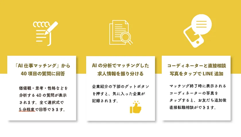(2)AIが質問の回答結果を分析し、利用者それぞれに合った企業を提案します。利用者の性格や価値観に合う企業が1日3社表示されます。