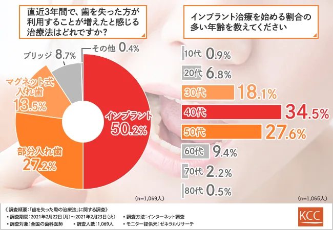 また、治療を放置してしまうと30代や40代でも歯が抜けやすくなることが判明し、歯科医師の半数の方は直近3年でインプラント治療を受ける方が増えていると回答しました。